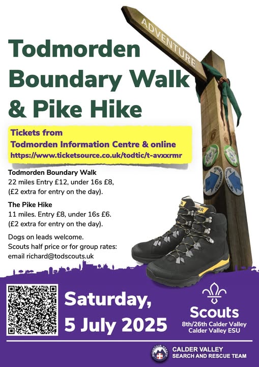 Saturday 5th July 2025, Registration and start is at Riverside (Bellhome), Rochdale Road, Todmorden OL14 6UH. 8-9am for the Boundary Walk. 9-10am for the Pike Hike. Todmorden Boundary Walk: 22…